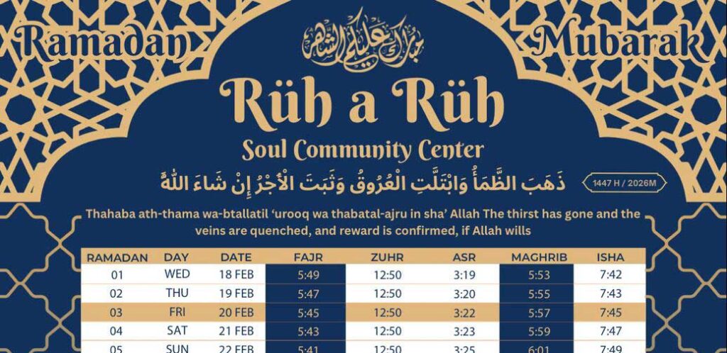 Rüh a Rüh Mosque warmly welcomes you to join us for all five daily prayers throughout the week, led by our dedicated Imam and community members. Every Friday, we gather for the special Jumu’ah prayer and khutbah (sermon), a sacred time for reflection, learning, and community connection. Whether you attend regularly or are visiting for the first time, you are always welcome to join us in worship and fellowship.